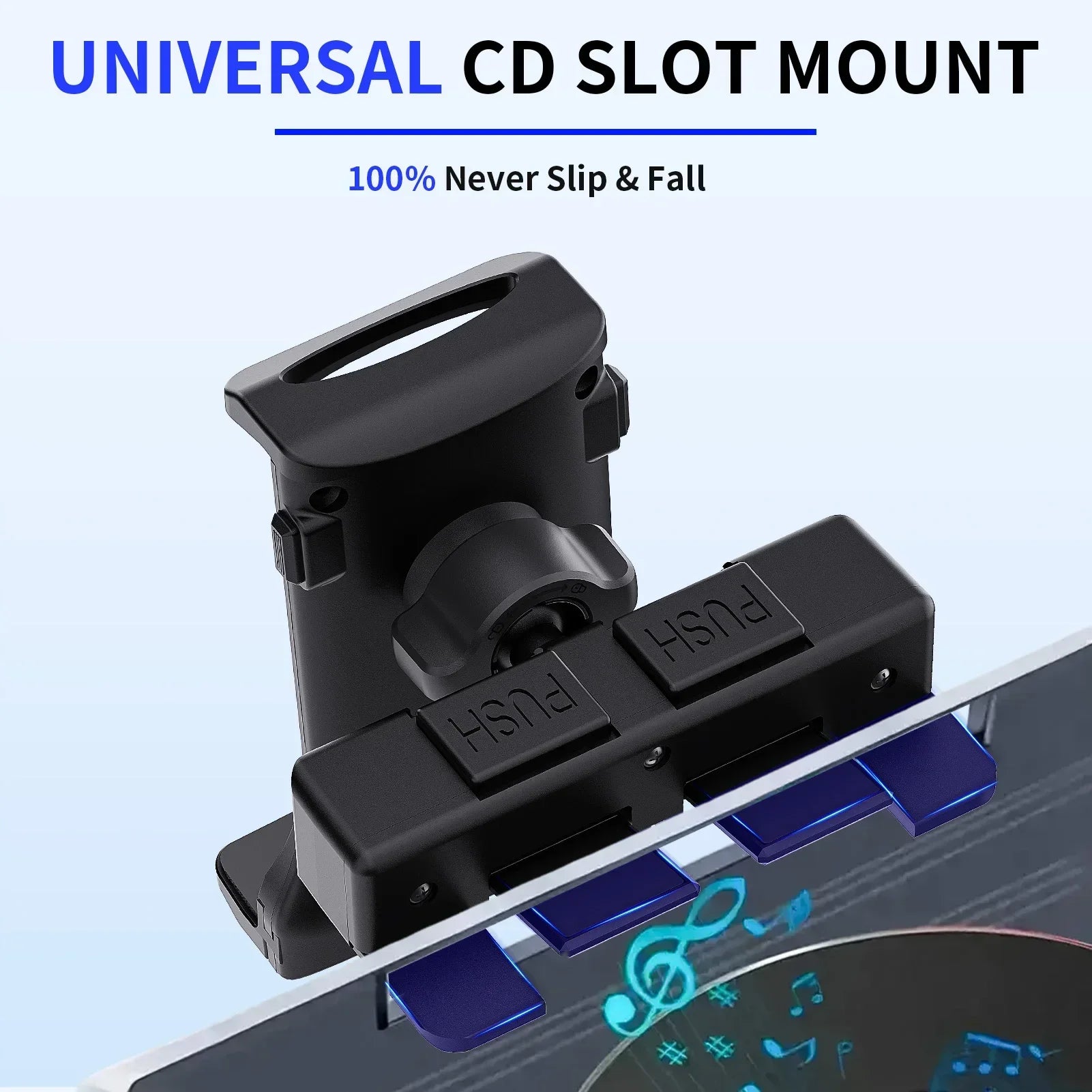 Universal 360° car tablet mount designed for maximum versatility. Made from high-quality ABS and silica gel, it ensures stability and durability during your journeys. The CD slot mounting system uses robust PC and ABS inserts for a secure hold. The triple-jointed PVC clip provides a firm grip and adapts to various configurations. Full 360-degree rotation allows for horizontal or vertical orientation as needed. Compatible with iPad Pro 12.9", iPad Air, Mini, iPhone 16-13", Samsung Fold, and Xiaomi tablets from 4 to 13 inches. Adjustable left-right positioning for optimal screen access. Sleek black design, simple installation without additional tools.