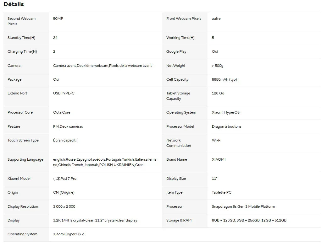 Tablette premium 13 pouces conçue pour créatifs et professionnels mobiles. Écran OLED haute résolution avec reproduction colorimétrique exceptionnelle et taux de rafraîchissement adaptatif. Processeur flagship offrant puissance de calcul pour édition vidéo, retouche photo et applications professionnelles. RAM généreuse et stockage SSD rapide garantissant multitâche fluide et chargements instantanés. Système audio immersif avec haut-parleurs stéréo Dolby Atmos. Batterie haute capacité avec charge rapide pour autonomie prolongée. Connectivité WiFi 6E et optionnelle 5G pour transferts de données ultrarapides. Support stylet précis pour dessin numérique et prise de notes. HyperOS optimisé pour productivité avec fenêtres flottantes et multitâche avancé. Design élégant en aluminium. Solution complète pour création de contenu et travail professionnel exigeant.